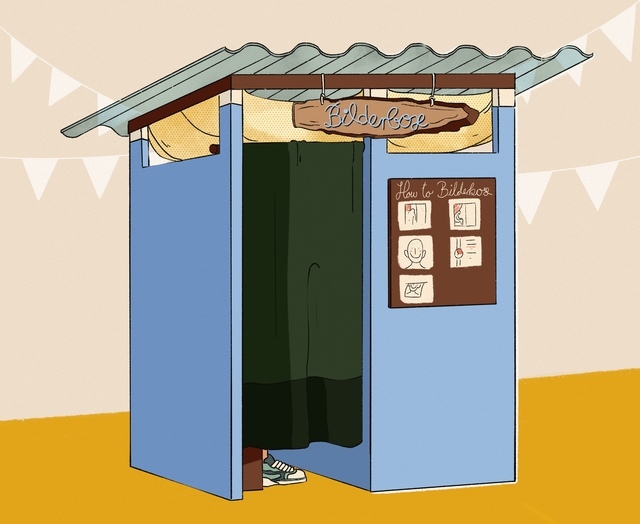 The picture box (Bilderbox) is a small box in front of the (large) Schuhkarton. It works something like this: You sit down in it, alone or in company, and have a few minutes. What happens next is not strictly predictable, but in most cases is similar to what happens in a photo booth. However, a camera is definitely not involved.
